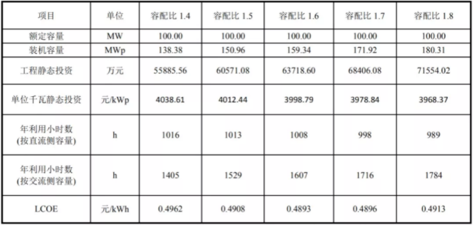 既然容配比的作用這么大,是不是可以無限擴大容配比呢?其實不是這樣的。以典型中部地區(qū)合肥為例,采用固定式+單面組件+集中式逆變器,可以發(fā)現(xiàn)容配比為1.6的情況下,光伏度電成本最低,故選擇1.6為最優(yōu)容配比。