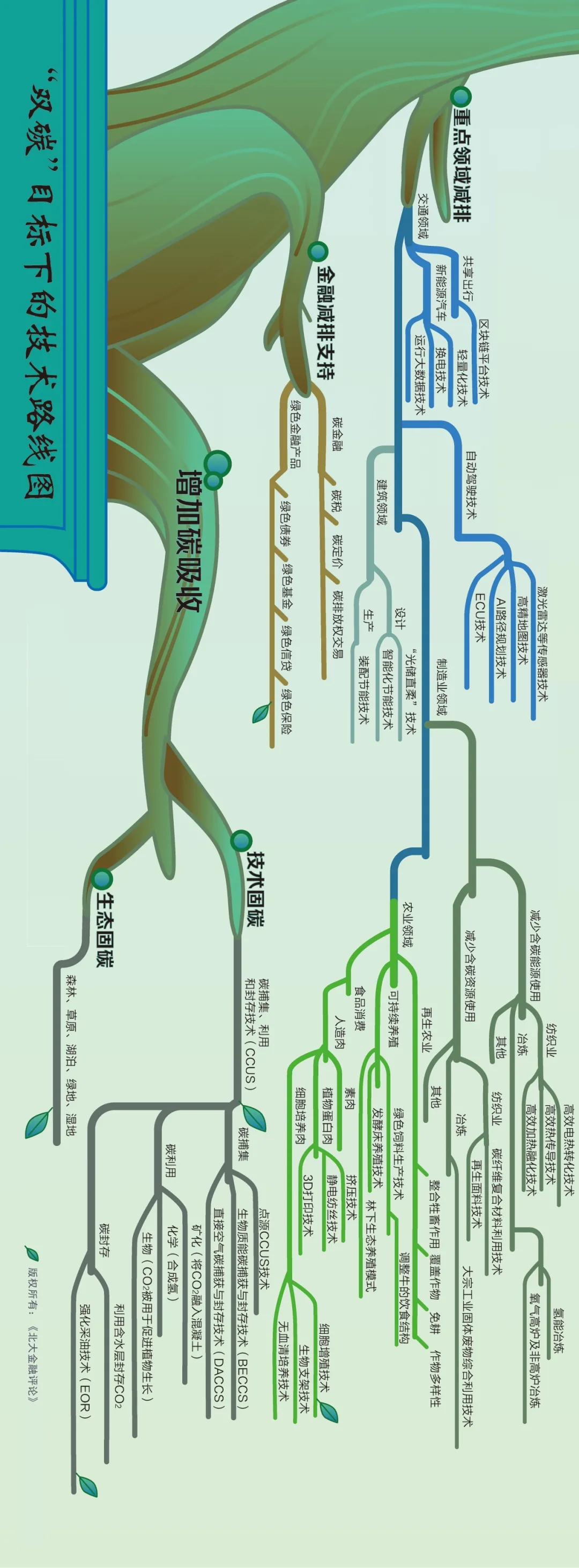 近日,《北大金融評論》發(fā)布“雙碳”目標(biāo)下的技術(shù)路線圖,包括減少碳排放和增加碳吸收2條主路線。其中,減少碳排放包括能源結(jié)構(gòu)調(diào)整、重點領(lǐng)域減排和金融減排支持3條路線,增加碳吸收又包括技術(shù)固碳和生態(tài)固碳2條路線。如此逐級細化,得到完整技術(shù)路線圖(該圖不代表本公眾號觀點)。