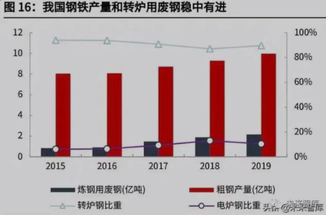 碳達(dá)峰、碳中和提出后,電爐(如果使用清潔能源)具有一定的減排效果,路線 低碳化轉(zhuǎn)變的過程中,會(huì)提升廢鋼的需求。