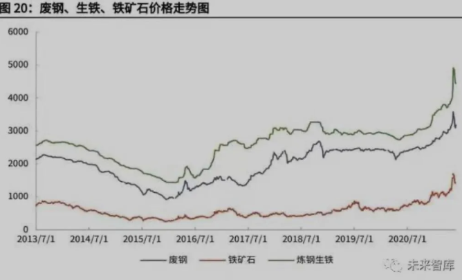(3)在供給側(cè):2015 年的中央經(jīng)濟(jì)工作會(huì)議上,中央提出“三去一補(bǔ)一降”(去 產(chǎn)能、去庫(kù)存、去杠桿、降成本、補(bǔ)短板)五大任務(wù),從 2016 年起,對(duì)鋼鐵行 業(yè)整體進(jìn)行了供給側(cè)改革,拉動(dòng)鋼價(jià)上漲,原材料價(jià)格也水漲船高。