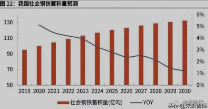 廢鋼的來(lái)源可分為折舊廢鋼(即日常生活里報(bào)廢器材中含有的鋼鐵)、鋼廠自產(chǎn) 廢鋼以及加工廢鋼。其中折舊廢鋼在廢鋼資源總量中所占的比例逐年增長(zhǎng),根據(jù) 中國(guó)工程院黑色金屬礦產(chǎn)資源強(qiáng)國(guó)戰(zhàn)略研究專題組的研究,折舊廢鋼可利用量可 以用社會(huì)鋼鐵蓄積量折算法得出,進(jìn)而可以算出廢鋼資源總量。廢鋼產(chǎn)生率參考 美國(guó)、日本、俄羅斯等國(guó)的數(shù)據(jù)取 2.5%,2030 年社會(huì)鋼鐵蓄積量預(yù)測(cè)為 132.6 億噸,折舊廢鋼占比以 80%計(jì),回收率以 90%考慮,則 2030 年社會(huì)廢鋼可利 用量將達(dá)到約 3 億噸。