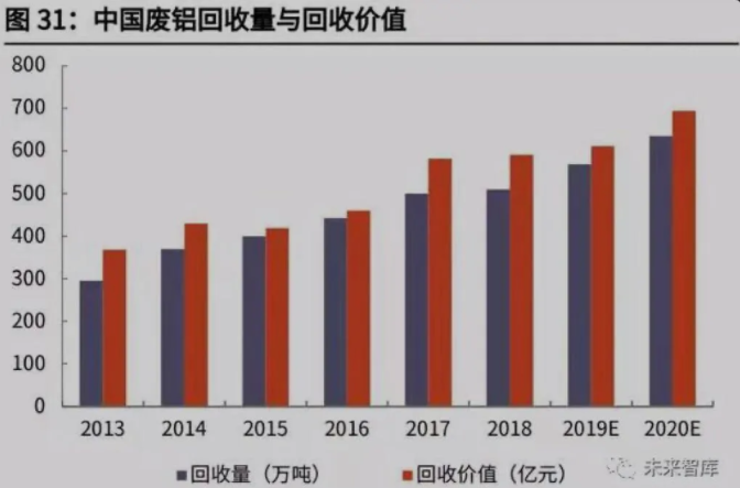 從再生資源回收結(jié)構(gòu)上看,廢鋼、廢有色金屬(主要是廢鋁和廢銅)、廢紙、廢 塑料等無(wú)論是在回收量(合計(jì)占比超過 90%)上還是回收價(jià)值(合計(jì)占比超過 95%)上,均位列前四。以下將就這四類可再生資源的循環(huán)使用進(jìn)行重點(diǎn)分析, 其中廢有色金屬將以廢鋁為例。