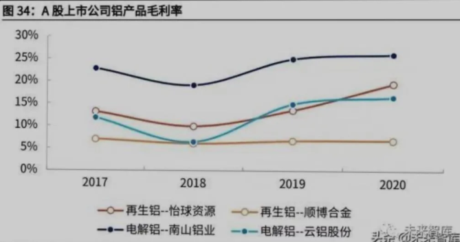 而通過比較 A 股上市的電解鋁和再生鋁制造企業(yè)具體到產(chǎn)品的毛利率,原鋁企 業(yè)的表現(xiàn)也整體更好,如作為原鋁制造龍頭之一的云鋁股份在鋁錠上的毛利率高 出順博合金 10 個(gè)百分點(diǎn)(2020 年數(shù)據(jù))。
