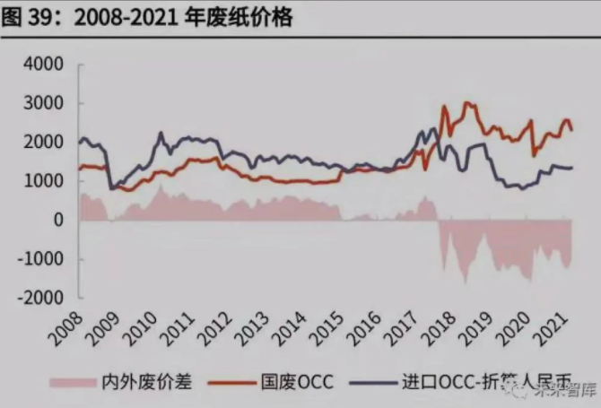 隨著“限廢令”的逐漸收緊,我國(guó)廢紙進(jìn)口量大幅減少,國(guó)廢價(jià)格一路飆升。2018 年前我國(guó)的廢紙進(jìn)口量基本在 2500-3000 萬(wàn)噸,2018 年后開始大幅下降, 2019 年下降至 1000 萬(wàn)噸,并有望于 2021 年下降至 0(根據(jù)《關(guān)于全面禁止進(jìn) 口固體廢物有關(guān)事項(xiàng)的公告》要求,2021 年 1 月 1 日起禁止以任何方式進(jìn)口固 體廢物)。隨著規(guī)模紙廠的廢紙庫(kù)存的耗盡,預(yù)計(jì)未來(lái)國(guó)廢價(jià)格將持續(xù)上升。