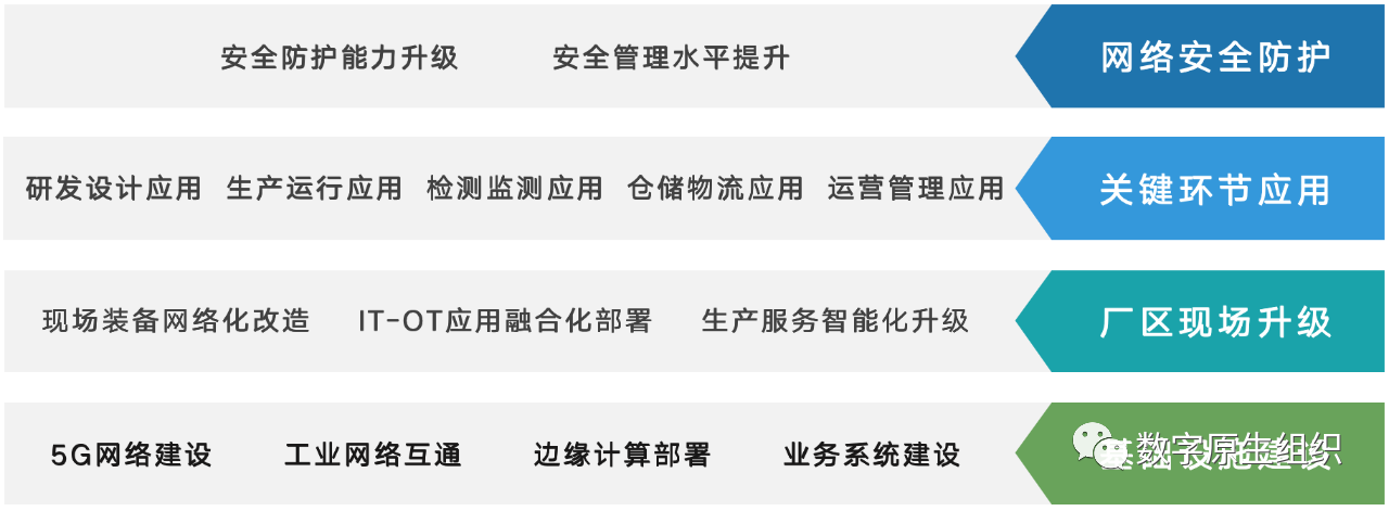 建設內(nèi)容包括基礎設施建設、廠區(qū)現(xiàn)場升級、關鍵環(huán)節(jié)應用、網(wǎng)絡安全防護四個層面: