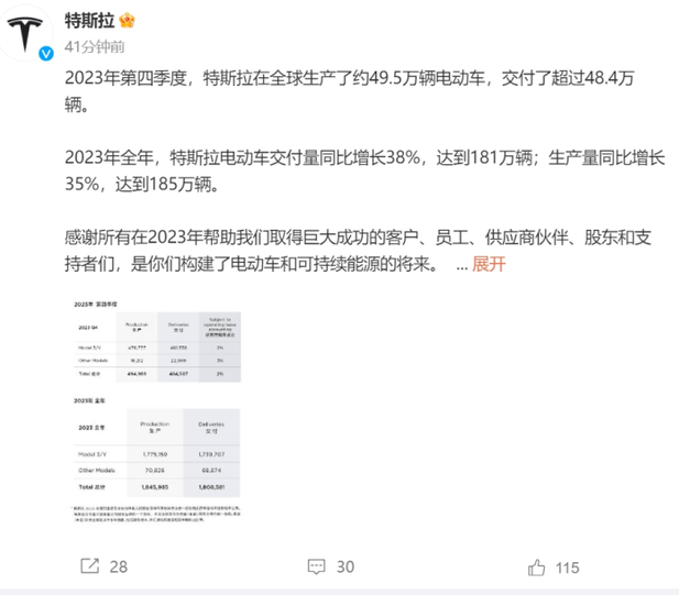 具體來看,根據特斯拉官方微博發布的數據顯示,2023年第四季度,特斯拉在全球生產了約49.5萬輛電動車,交付了超過48.4萬輛。2023年全年,特斯拉電動車交付量同比增長38%,達到181萬輛;生產量同比增長35%,達到185萬輛。